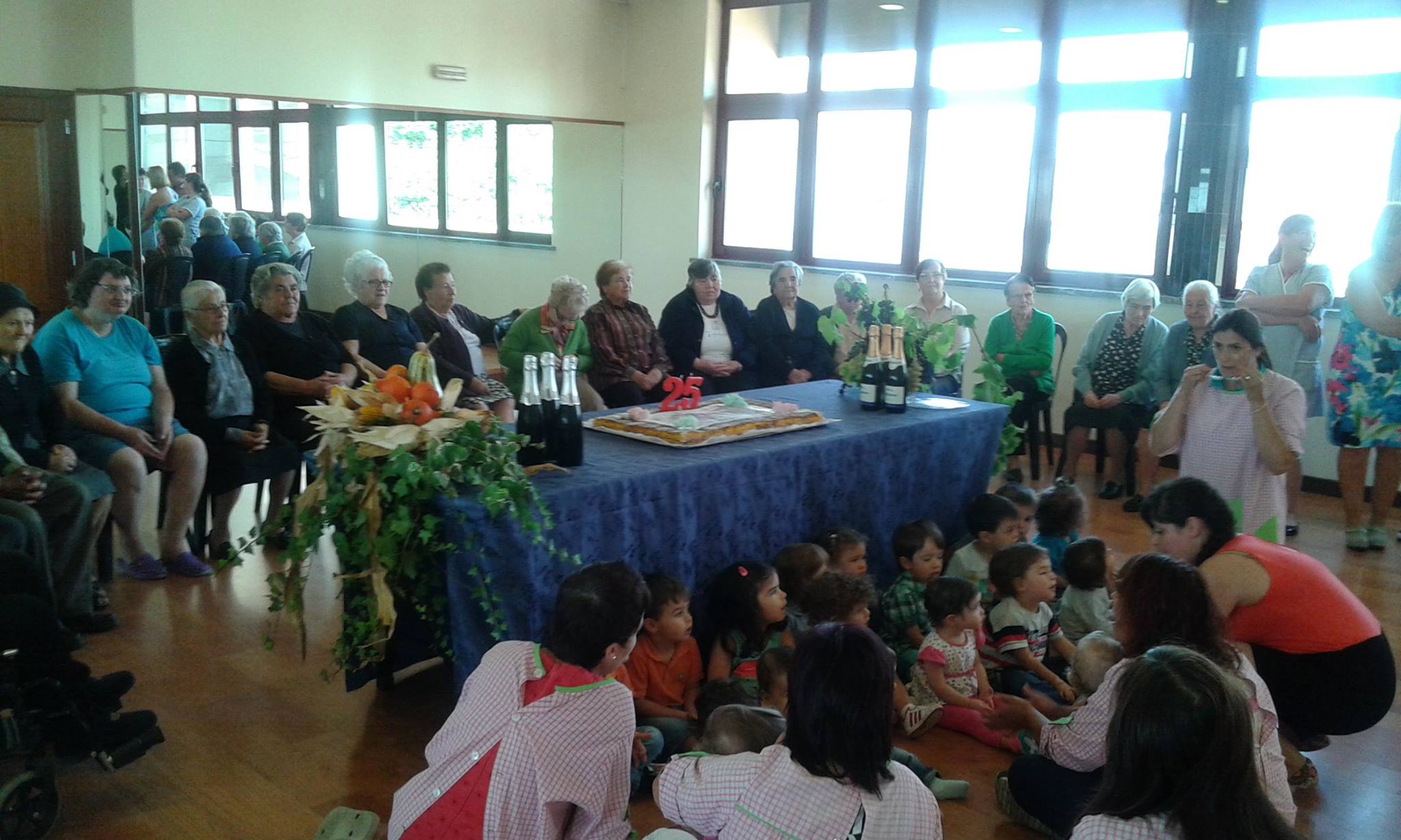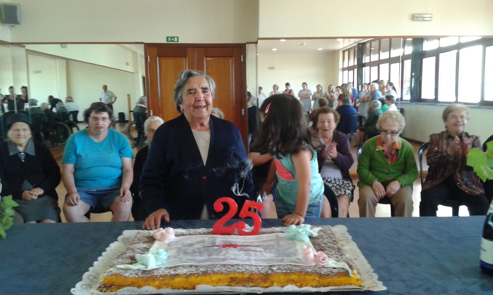 Juntámos as crianças, idosos e colaboradores da nossa instituição. Cantámos os parabéns e apagámos as velas com ajuda da utente mais idosa e de uma criança.